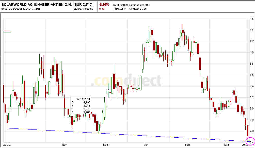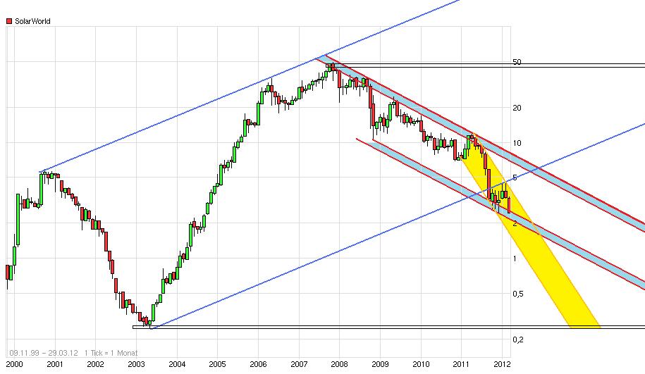 ... trotz meiner zuversichtlichen Sicht der Dinge! Also, wo ist das Problem von SolarWorld? Gewiss nicht darin, dass hier Geld "verbrannt" wurde. Es wurden Fabriken gebaut, geforscht, geworben, um PV voranzubringen. Viele Konkurrenten kamen in den letzten Jahren weltweit dazu, wohl weil erkannt wurde, dass PV eine Zukunftstechnologie ist. Vor allem dieFabriken in China, die wie Pilze aus dem Boden schossen, wurden subventioniert (um in Deutschland EEG-Subventionen abzuschöpfen!). In jeder Industrie gibt es Phasen mit Überkapazitäten und dadurch fallenden Preisen. Da muss man hindurch. Bei PV scheint alles anders - irgendwie läuft da was tiefenpsychologisch ab: es gibt offenbar einige richtige Solarhasser, die narzisstisch gekränkt sind ob der Zukunftslosigkeit von Atom und Öl. E.on und RWE heißt es, stoppen ihre ambitionierten Atomkraftwerksbaupläne in Großbritannien. Der Siegeslauf von PV wird nicht aufzuhalten sein.- Im übrigen: SolarWorld baut nicht nur einfach ein paar Module, wie sie inzwischen jeder bauen kann, sondern bietet intelligente Komplettsysteme für die differenzierten Bedürfnisse von PV-Energiegewinnung an. Die Zukunft ist sonnig und smart, auch wenn der derzeitige Aktienkurs katastrophal ist - und wenn Merrill Lynch und Co. weiter tönen, noch katastrophaler werden wird. Meine Aktien jetzt zu verkaufen, wäre unmoralisch, denn dann würde ich ja einem anderen bewusst Schaden zufügen, wenn es zu einer Insolvenz kommen sollte. Also halte ich sie weiter.