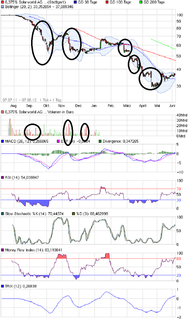 Ein kleiner Denkfehler von Dir, meingott, dass die Mehrheit der Aktionäre für den Kurs der SolarWorld-Aktie und SolarWorld-Anleihen bestimmend ist. Fakt ist doch, dass relativ kleine Volumina gehandelt werden. Bei der Aktie wird Tag für Tag ein Prozentanteil von unter 1% der Aktien immer wieder hin- und her geschoben. Ein Zocker will klüger sein als der andere - und man schafft es vielleicht, dem ein oder anderen langfristig orientierten Anleger seine Anteile aus der Tasche zu ziehen, weil der entnervt aufgibt. Bei der Anleihe spielt man mit den Verlustängsten - aber gewiss hat nicht die Mehrheit der Gläubiger ihre Papiere auf den Markt geworfen. Panikmache, die oft genug interessegeleitet ist, kann einen Kurs erheblich beeinflussen. Wer klaren Verstand hat, sitzt die Baisse aus.