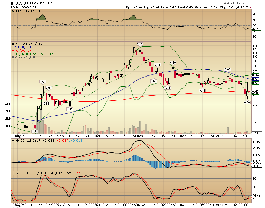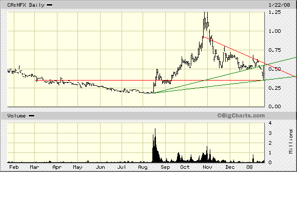 NFX GOLD INC. (TSX-V:NFX) experienced a 7.32% rise in share value Tuesday combined with 227,100 shares traded. On January 22nd they announced that a surface diamond drilling program has commenced on the Lemoyne North Property. This development has earned the attention of our team at Pinnacle Digest. The program is pursuant to their July 2007 option and joint venture agreement with Eloro Resources Ltd. We are focused on how it will affect their progress and goals over the next few months and are debating the potential ramifications.