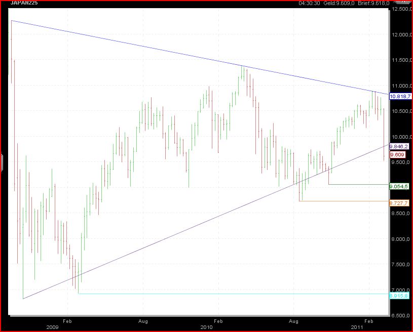 In Japan wird es einen wirtschaftlichen Supergau geben, die Spuren der Katastrophe werden noch in vielen Jahren sichtbar sein. Vermutlich wird es morgen gleich zu Handeslaussetzungen kommen, denn der Nikkei wird in den nächsten Wochen mehrere 1000 Punkte fallen. Morgen wird jeder versuchen sein Depot von japanischen Aktien zu befreien.....da wirds kein Halten mehr geben...