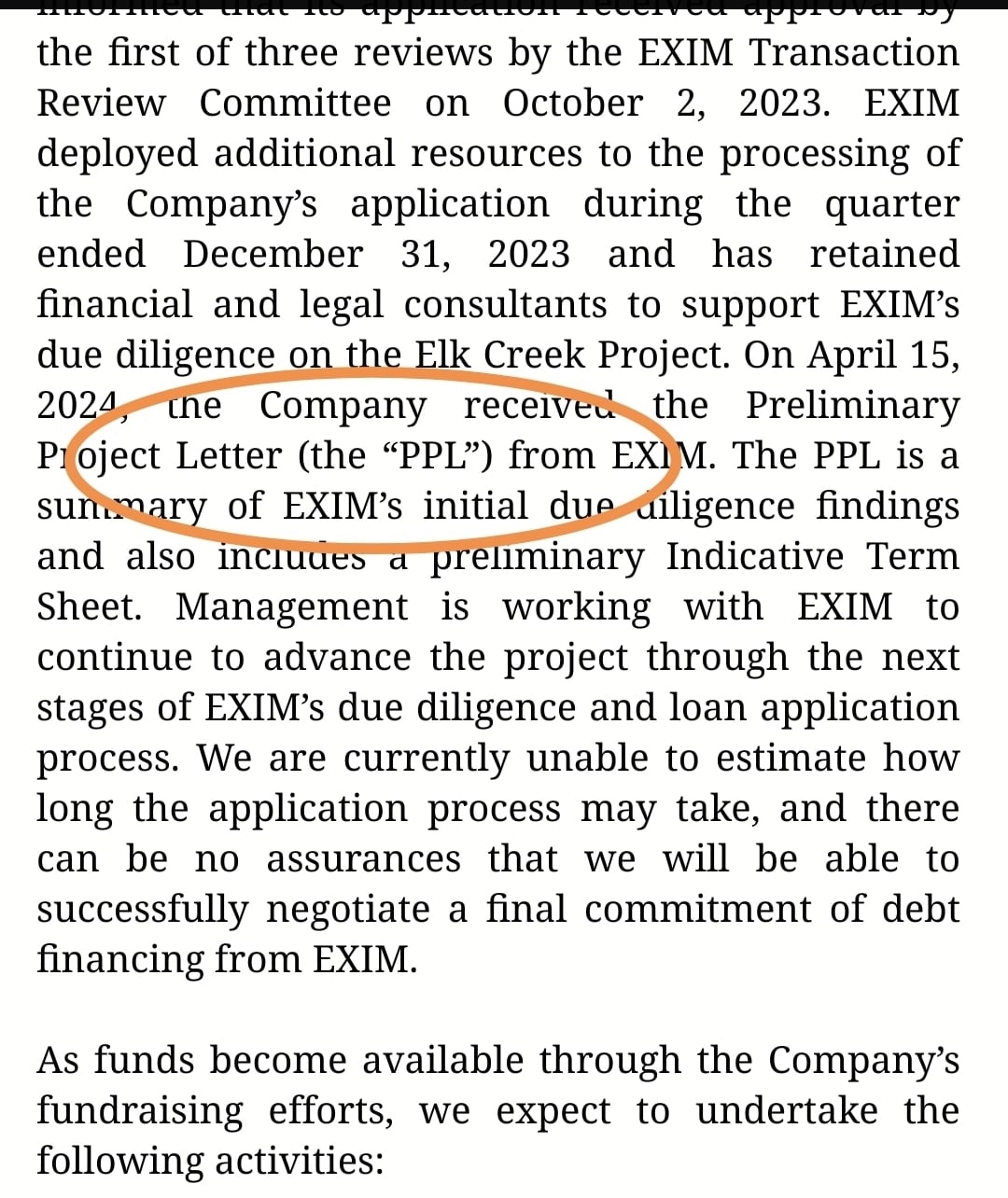 Die Erlöse aus einer der mehreren Finanzierungen, an denen wir derzeit arbeiten, sind für die Kosten mehrerer Elemente des Projekts vorgesehen: (1) Fertigstellung unserer aktualisierten Machbarkeitsstudie, einschließlich der Entwicklung des neuen Prozessablaufs des Projekts; (2) Kosten im Zusammenhang mit der Due-Diligence-Prüfung des Kredits durch die EXIM-Bank; (3) Kosten im Zusammenhang mit der Due-Diligence-Prüfung großer Kapitalbeteiligungen, die für die Fertigstellung der CAPEX-Voraussetzungen des Projekts erforderlich sind; (4) möglicher Erwerb von zusätzlichem Land in Nebraska; und (5) weitere Fortschritte des Projekts bis zum Baubeginn, wie z.B. die Durchführung zusätzlicher Bohrungen, die Vorbereitung der Installation von Versorgungsleitungen oder andere Vorbereitungsarbeiten am Standort; (6) Rückzahlung der Schulden, die wir vor kurzem aufgenommen haben; und (7) andere projektbezogene Ausgaben.
