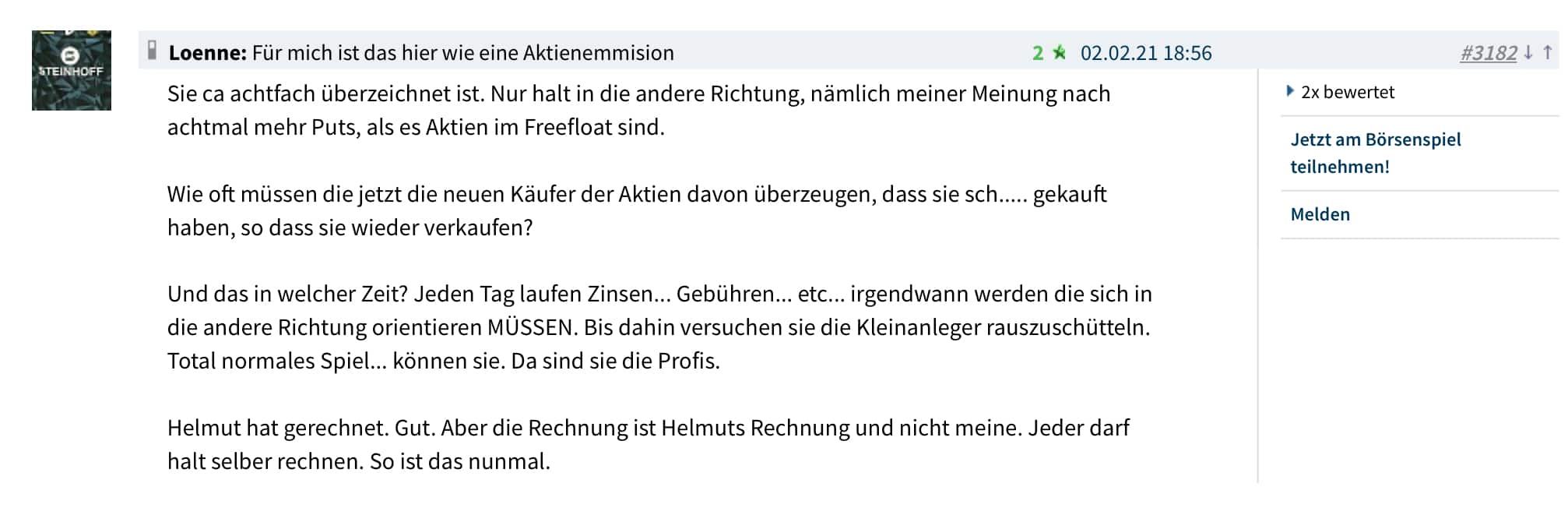 wie hoch der Kurs bei einem Squeeze laufen wird, denke aber nicht dass der Kurs danach wieder auf 10$ runter geht, bei GME ging es von ca 5$ auf ca 400$ und jetzt stehen sie nach einem Rückgang auf ca 130$ wieder bei ca 200$. Geht man davon aus dass AMC bedingt durch all die synthetischen Shares vllt einen Kurs von paar tausend Dollar erreicht, wird sich der Kurs danach auf vllt einige hundert Dollar vllt auch tausend Dollar einpendeln. So oder so wird das eine ziemlich geile Sache werden, ist aber wie immer nur meine persönliche Meinung