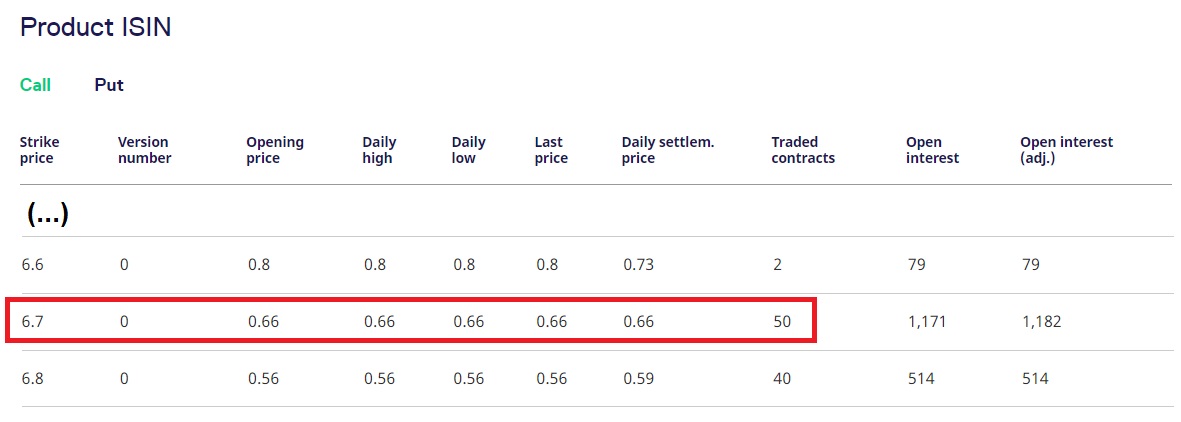Wertlos verfallen werden die 50 Optionen, wenn der Kurs am Verfallstag weniger als 6,70 € ist. Nur dann kann er die Prämie ohne Gegenleistung behalten. Heute sind die Optionen ITM für den Käufer.