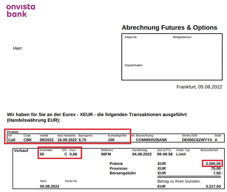 Das Ergebnis ist vllt das Gleiche. Schubbi muss am Verfallstag 5000 CBK liefern, wenn der Kurs höher als der Basispreis ist (6,70). Wenn der Kurs weiter über 7,20 € bleibt oder sogar steigt, muss er sie trotzdem für 6,70 € pro Stück hergeben. Hat aber 0,66 € Prämie bekommen, ist also äquivalent wie ein Verkauf zu 7,36 € pro Aktie.