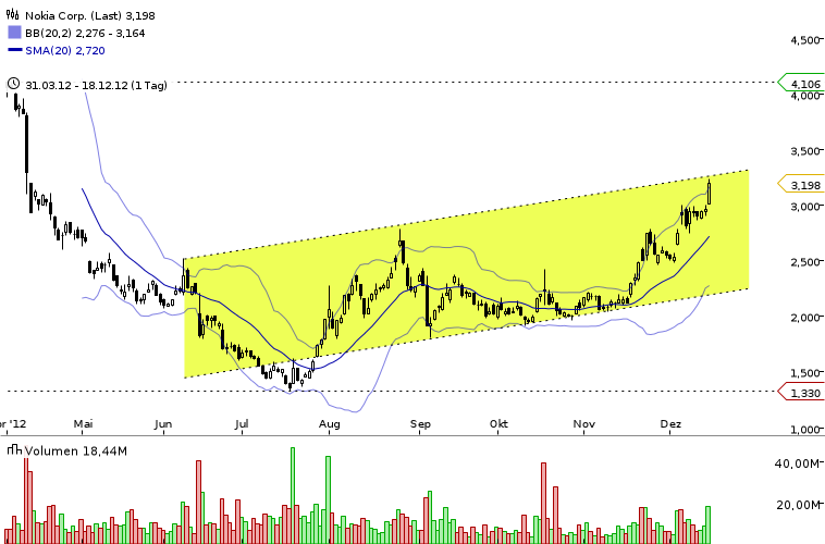 das Problem ist never fight the trend, soll heißen bei Nokia auf Rücksetzer zu setzen oder auf fallende Kurse wäre falsch. Lies den chart und da steht kaufen, die fundamentalen Daten, Kundenzufriedenheit beim neuen Handy erklären den Chratverlauf. Aktienkurse übetreiben zu beiden Seiten nach unten und nach oben, daher hat Elop auch bei 1,7 circa 200000 Aktien gekauft, nach 98% minus vom Top