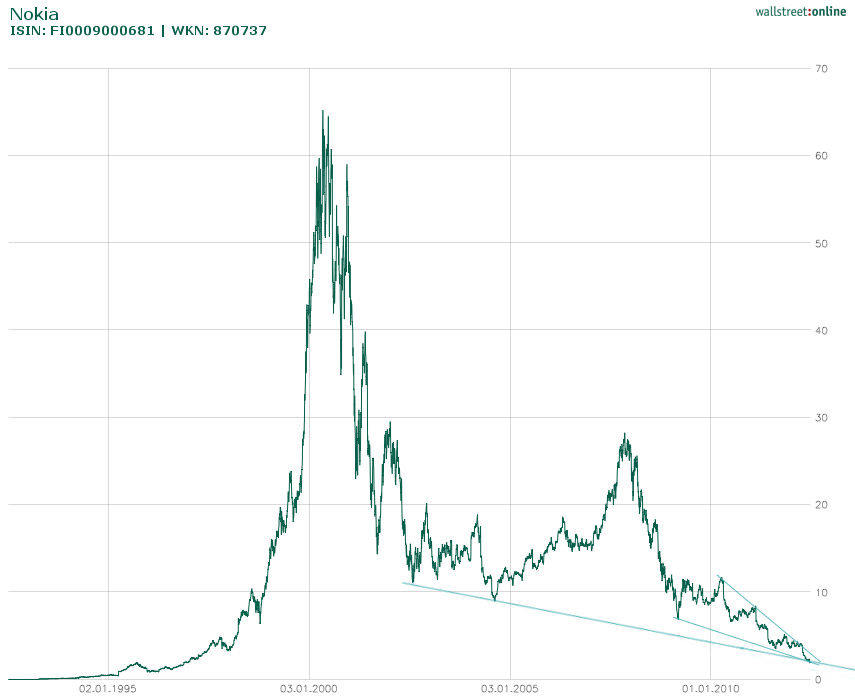 Mehr als ein Jahrzehnt später steht der zahlenmäßig noch immer größte Handyhersteller Europas nicht nur mit dem Rücken zur Wand – es geht nunmehr ums nackte Überleben, das ist allerspätestens seit gestern klar, als Nokia erneut eine happige Gewinnwarnung und den Wegfall jedes fünften Arbeitsplatzes bekanntgab. Die Aktie fiel um 16 Prozent auf ein 16-Jahrestief. Noch Mitte des vergangenen Jahrzehnts schien ein solches Schicksal undenkbar: Nokia war mit Abstand größter Handyhersteller der Welt, dem allenfalls von dem aufstrebenden Smartphone-Rivalen Research in Motion mit seinem Blackberry Konkurrenz zu drohen schien.