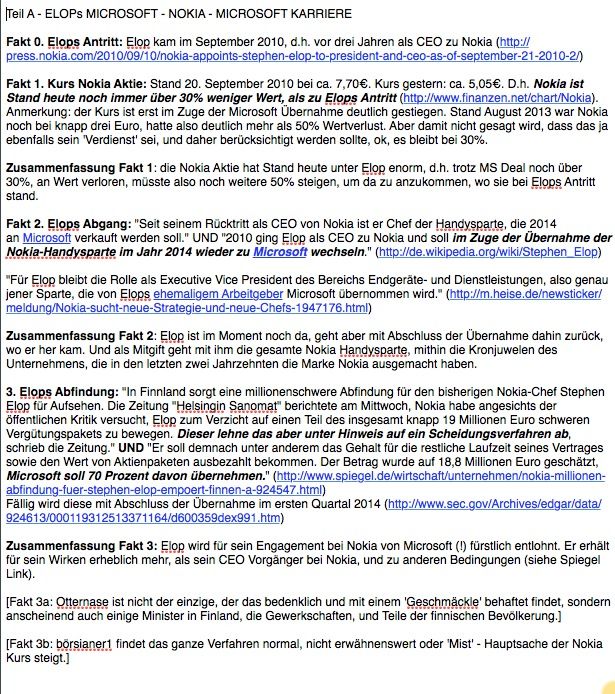 Aufmerksame Leser haben sicher bemerkt, dass die Beleidigungen nicht von mir ausgegangen sind. Ich bin Elop gegenüber sehr kritisch, weil ich ihm vorwerfe, dass er Nokia kaputt gemacht hat. Und wenn das richtig ist, dann sollte das jeder in seiner Anlagestrategie berücksichtigen, der sich für Nokia interessiert.