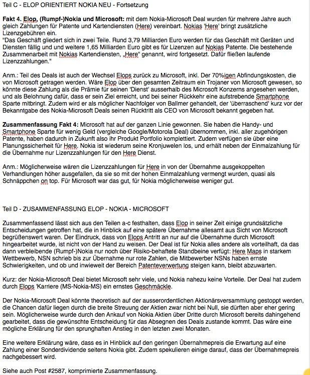 Ich schrieb mehrfach, dass ich genau auf eine Microsoft Übernahme (als Ganzes, mit späterem Verkauf von NSN) spekuliert habe, dass ich kurzfristig orientiert war, es mich aber schmerzt, wie Nokia aus meiner Sicht (!) über den Tisch gezogen wurde. Und ich schrieb, dass ich, wie wohl einige der Leute hier, wohl nach dem Deal nicht mehr dabei sein werde.