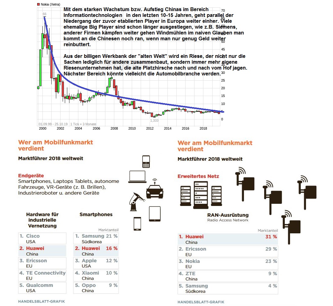 Die Nokia Aktie notiert ja nicht zufällig auf einem Mehrjahrestief. Die Niedergang geht ja nun schon lang einher mit dem Aufstieg Chinas. Nokia ist seit langem dafür bekannt Dinge zu verschlafen. Man denke nur an den Niedergang der Handysparte. Wenn die Alt-Etablierten wie z.B. Nokia oder Ericsson nicht rechtzeitig aus dem Quark kommen bei 5G, dann freut es Firmen wie ZTE und Huawei, die das Feld dann mit Schwung aufrollen und technisch und preislich überlegen sind. Die haben mit viel staatlicher Hilfe ihre Hausaufgaben deutlich eher gemacht und werden den technologischen Vorsprung weiter verteidigen, auch wenn Nokia noch mehr Geld ausgibt, weil die Chinesen auch weiter F&E im großen Maß betreiben. Da Huawei keine börsennotierte Gesellschaft ist, kann Huawei preislich so aggessiv fahren wie sie wollen. Hier steht nicht Profit im Vordergrund, sondern Verdrängung/Marktanteil bzw. darum dem chinesischen Apparat soviel Einfluß und Informationen wie möglich zu geben.