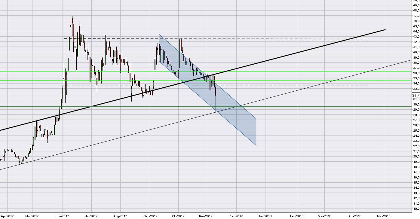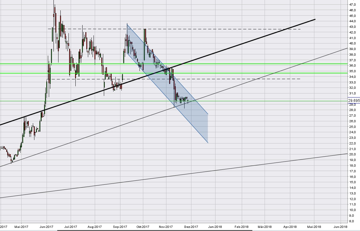 Bei 35 Euro liegt jetzt allerdings ein Wiederstand, durch das dort fallende mittlere Bollinger Band Dreimonatsbasis...