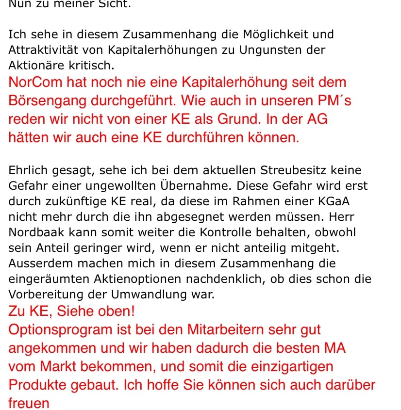Ehrlich gesagt, sehe ich bei dem aktuellen Streubesitz keine Gefahr einer ungewollten Übernahme. Diese Gefahr wird erst durch zukünftige KE real, da diese im Rahmen einer KGaA nicht mehr durch die ihn abgesegnet werden müssen. Herr Nordbaak kann somit weiter die Kontrolle behalten, obwohl sein Anteil geringer wird, wenn er nicht anteilig mitgeht.