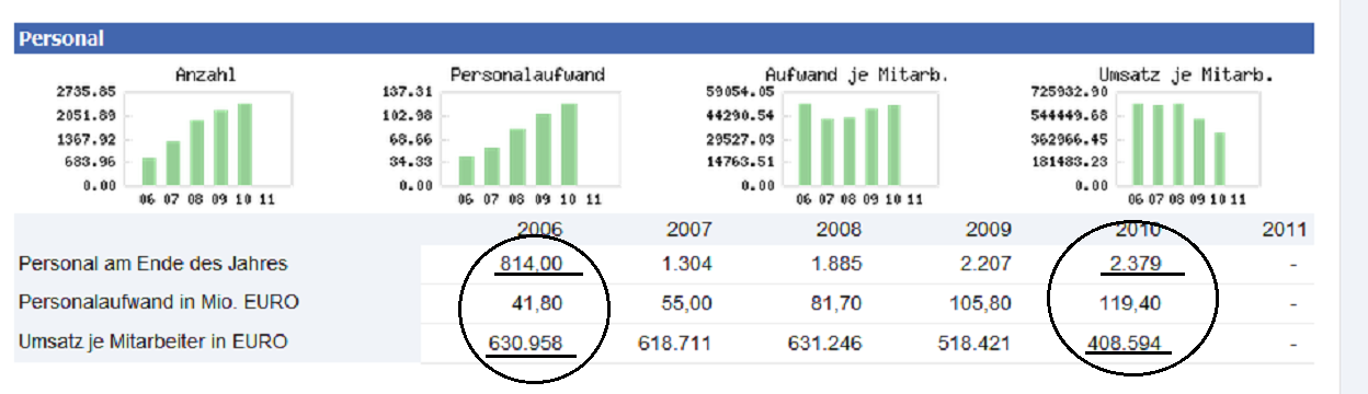 5. Das der Umsatz aufs Personal bezogen sinkt ist doch eine logische Konsequenz, schließlich wurden in den letzten Jahren viele Aufträge verschoben dazu sinken die Preise pro MW Um dem entgegen zuwirken sind ja bereits erhebliche Maßnahmen von Nordex in die Wege geleitet worden. Da aber auch 2011 wieder Projekte nach 2012 verschoben wurden, werden die Zahlen im Geschäftsjahr 2011 sich wohl nicht verbessert haben.