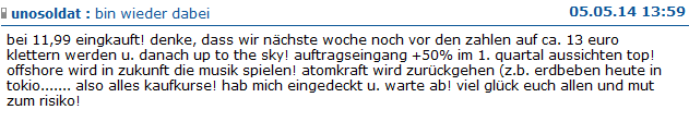 und die drei koffer, die hier unentwegt müll reinstellen, die werden noch denselben Schwachsinn schreiben, wenn nordex bei 15,- und höher steht.