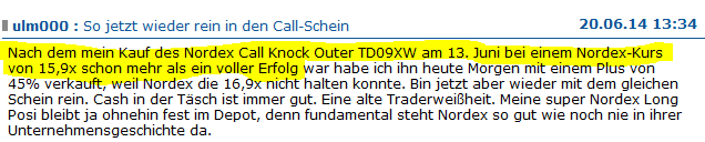 TD09XW am 13. Juni bei einem Nordex-Kurs von 15,9x schon mehr als ein voller Erfolg war habe ich ihn heute Morgen mit einem Plus von 45% verkauft, weil Nordex die 16,9x nicht halten konnte. Bin jetzt aber wieder mit dem gleichen Schein rein. Cash in der Täsch ist immer gut. Eine alte Traderweißheit. Meine super Nordex Long Posi bleibt ja ohnehin fest im Depot, denn fundamental steht Nordex so gut wie noch nie in ihrer Unternehmensgeschichte da.