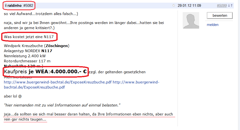 aber leider hat er da wieder einmal was verwechselt....Weil eine WEA besteht nun mal nicht nur aus der Turbine N117 so er meint in seinem Posting...vielleicht auf der Takatuka -raldinho-Nordexinseln...aber sicher nicht in einem Zivilisierten Land.