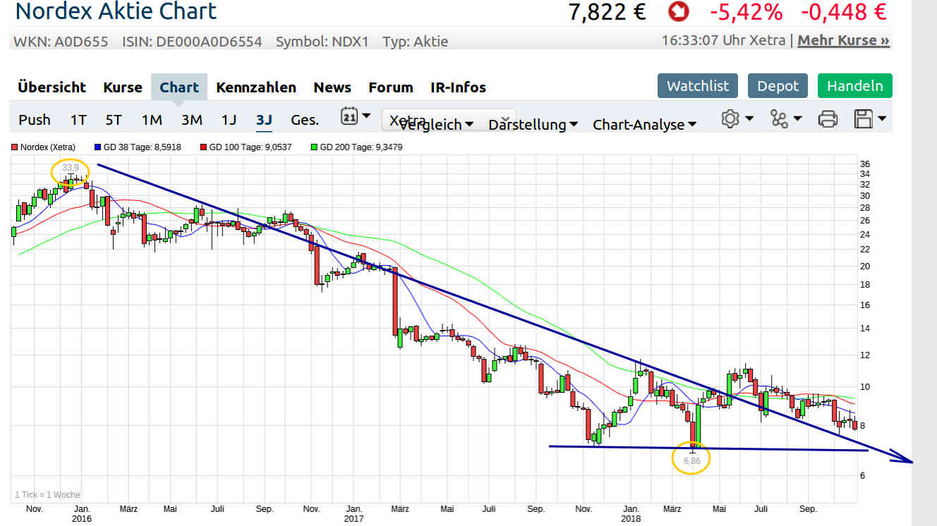 Für mich sieht es aktuell so aus als ob Nordex im kommenden Jahr wieder einigermaßen durchstarten könnte und ist eigentlich für mich ein ganz klarer Kauf. Zumal Nordex ja auch schon für 2020 satte 989 MW in Büchern stehen hat mit Brasilien, Südafrika und Schweden. Eigentlich deshalb, weil die Börse derzeit enorm zittrig ist und der DAX aktuell charttechnisch schon mehr als angeschlagen ist und der Dow Jones wieder mal mit seiner 200-Tageslinie kämpft.
