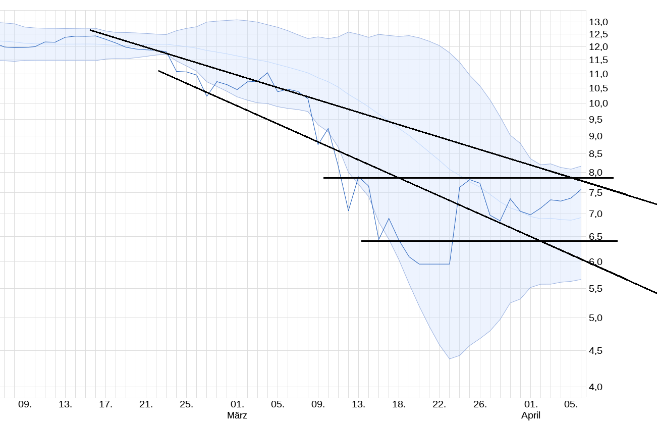 Ich lese daraus: Geht der Kurs hoch dann läuft er bis 9.60€, geht er runter schlimmstenfalls bis 4.25€. Und wenn wir Pech haben noch weiter, denn bis dahin muss mindestens einmal die Woche eine weitere Chartanalyse geliefert werden.