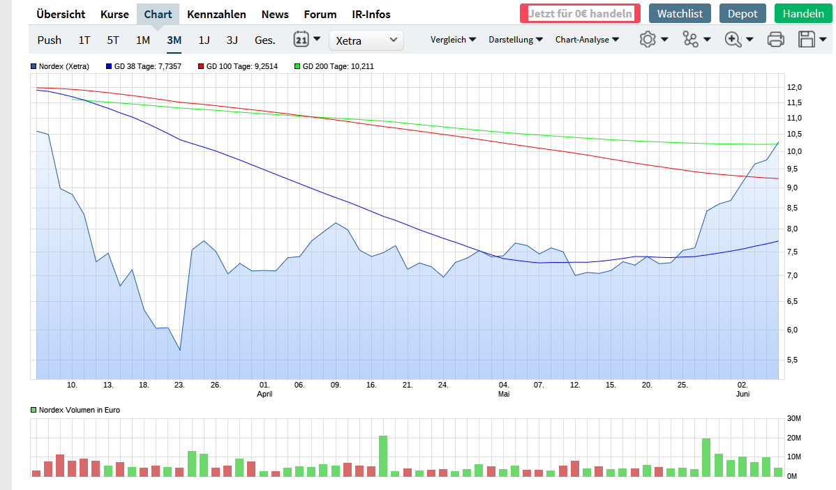 Gefällt mir sehr gut, wie stark Nordex die letzten Tage / Wochen performt und eigentlich ist man geneigt mal Teilgewinne mitzunehmen.