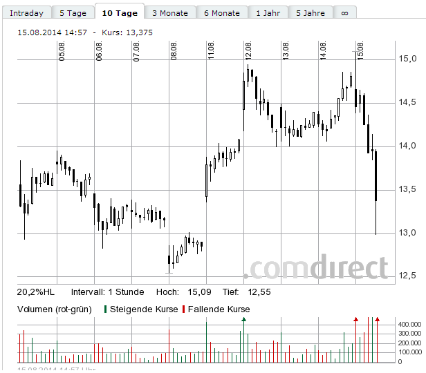 Ich denke mal, dass es heute sehr viele Trader komplett kalt erwischt hat und das zwar den ganzen Tag lang. Heute Morgen hat die Börse fälschlicherweise nur auf die Halbjahreszahlen geschaut (das war ja großteils bestimmt von den erstklassigen Q1-Zahlen) und darum ging es rauf und erst als einige gemerkt haben, dass die Q2-Zahlen nicht allzu gut waren, dann gings runter. Danach haben dann die Herren Trader wohl gedacht, ja bei 14 € ist Halt (100 Tageslinie) und schwupps hat es sie schon wieder kalt erwischt und selbst die 13,80 € haben nicht gehalten. Damit hat sich dann die Abwärtsspirale weiter beschleunigt, weil normale, große Trader bei Verlusten ab 2, 3% bzw. beim deutlichen Reißen von Chartmarken Ruck Zuck ohne zum Nachdenken raus gehen.