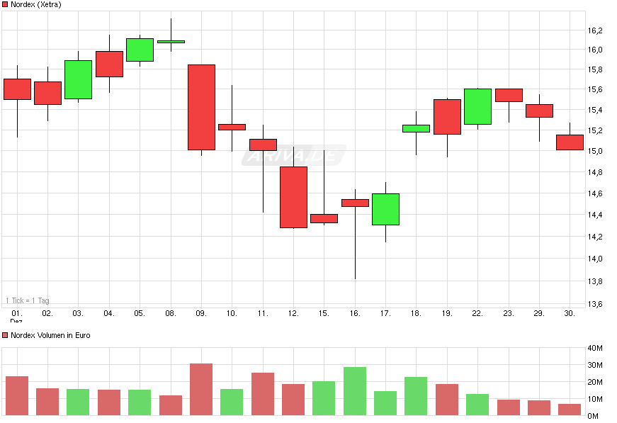 Nordex landet bei meiner 2014er Kursperformancerankingliste bei den Erneuerbaren Energie-Aktien immerhin auf Platz 4 und das zeigt welch Super-Invest Nordex in 2014 war. Auf 2 Jahressicht hat sich Nordex verfünffacht (von 3 € auf 15 €) und das sollte man nie vergessen, denn nach einem solchen rasanten Kursanstieg sind größere, scharfe Kurskonsolidierungen das Normalste an der Börse.