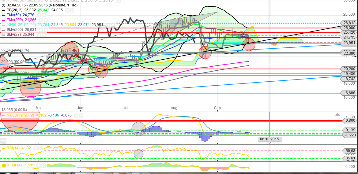 Die anderen wichtigen Indizes haben weitem nicht so stark korrigiert wie der DAX, der mit 13% sehr deutlich unter seiner 200-Tageslinie liegt. So liegt der MDAX nur 3% unter seiner 200er, der SDAX lediglich 2% und der TecDAX liegt sogar immer noch mit 7% deutlich über seiner 200-Tageslinie. Nordex liegt übrigens um 12,5% über ihrer 200er, die bei 20,85 liegt.