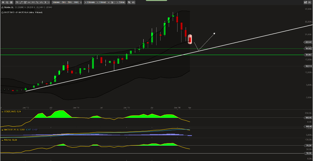 Jedenfalls wurden die Gewinnschätzungen für dieses Jahr nach der EBITA-Margenguidance deutlich nach unten revidiert von den Herren Analysten. Vor der Guidance lag die 2016er EPS-Schätzung noch bei 1,34 € und nun liegt sie gerade mal noch 1,08 € und hier ist auch noch eine EPS-Schätzung von 1,58 € (Goldman Sachs) mit drin. Die EBITA-Marge wird bei 8,3% gesehen. Somit wird Nordex beim aktuellen Kurs mit einem 2016er KGV von 21 bewertet. Vestas wird aktuell mit einem 18er KGV bewertet und die haben noch einen ganzen Sack voll Cash mit über 2 Mrd. € (= 9,50 € je Aktie) und Gamesa wird mit einem 2016er KGV von 19 bewertet.