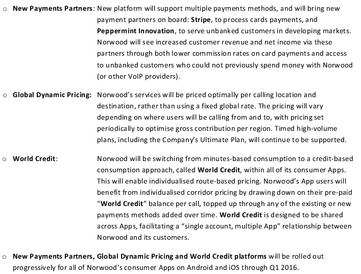 Mit viel Hype versuchten Zocker Norwood Systems (in Australien: NOR) nochmals kurz hochzujubeln was zum Teil auch vorrübergehend gelungen ist. Doch die Rally ist vorbei, denn deren Produkt hat in der heutigen Zeit keine wirkliche Zukunft auf globaler Ebene. Es gibt FB Messenger, WhatsApp, Viber, Skype, MagicJack, usw. und da scheint das Norwood Produkt grossteils hinfällig zu sein. Auch die App User sind bei Firmen dieser Art in der Bewertung kaum etwas wert. Gegen Jahresende schlitterte der Kurs ziemlich nach unten ab. Norwood ist unserer Meinung nach ein Short, ausser das Unternehmen schafft es "revolutionäre" Innovationen in deren Angebot zu integrieren.