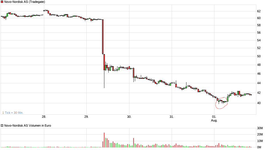 Wenn Du ein paar Seiten zurückblätterst, kannst Du lesen wer wann was dachte (und wer sich erst frisch zum Ablästern eingeklinkt hat). Ich habe schon mehrmals danebengelegen als ich dachte, es sei ein guter Zeitpunkt um nachzukaufen. Bei anderen Titeln spüre ich da oftmals Reue oder ich ärgere mich über meine Entscheidung (und das werden dann mitunter extreme Geduldsproben). Hier bei Novo Nordisk muß ich zugeben "ja, das war zu früh" oder "joah, das war zu optimistisch" und es ging noch weiter bergab (was auch nochmal um 20-30% passieren kann oder bis sonstwo aber nicht unter 0,00€!) - aber pikanterweise denke ich, daß es hier irgendwann auch wieder aufwärts gehen wird und in zehn Jahren der Ärger verflogen ist, weil ich "heute" um 10, 20 oder 40€ "zu teuer" (zu früh) gekauft habe.