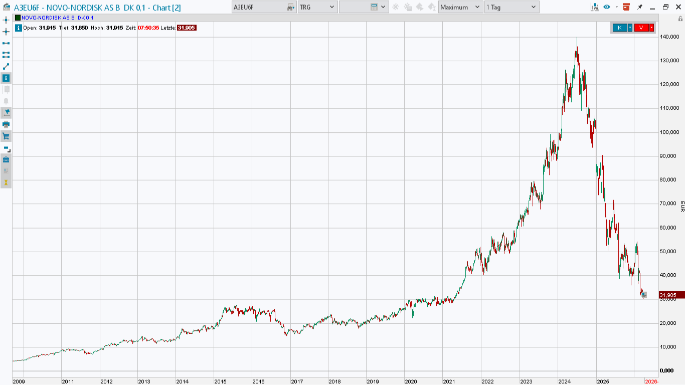 Zusammenfassend ist Novo Nordisk ein qualitativ herausragendes Unternehmen mit strukturellem Wachstum, hoher Profitabilität und klarer strategischer Positionierung. Die Aktie ist kein Schnäppchen, aber im Vergleich zur eigenen Historie nicht mehr überzogen bewertet. Für einen langfristig orientierten, konservativen Investor mit Fokus auf stabile Erträge und moderates Wachstum stellt Novo Nordisk eine solide Depotbeimischung dar. Entscheidend ist dabei weniger der perfekte Einstiegszeitpunkt als vielmehr die Bereitschaft, kurzfristige Bewertungsschwankungen zugunsten eines langfristigen Investmenthorizonts zu akzeptieren.