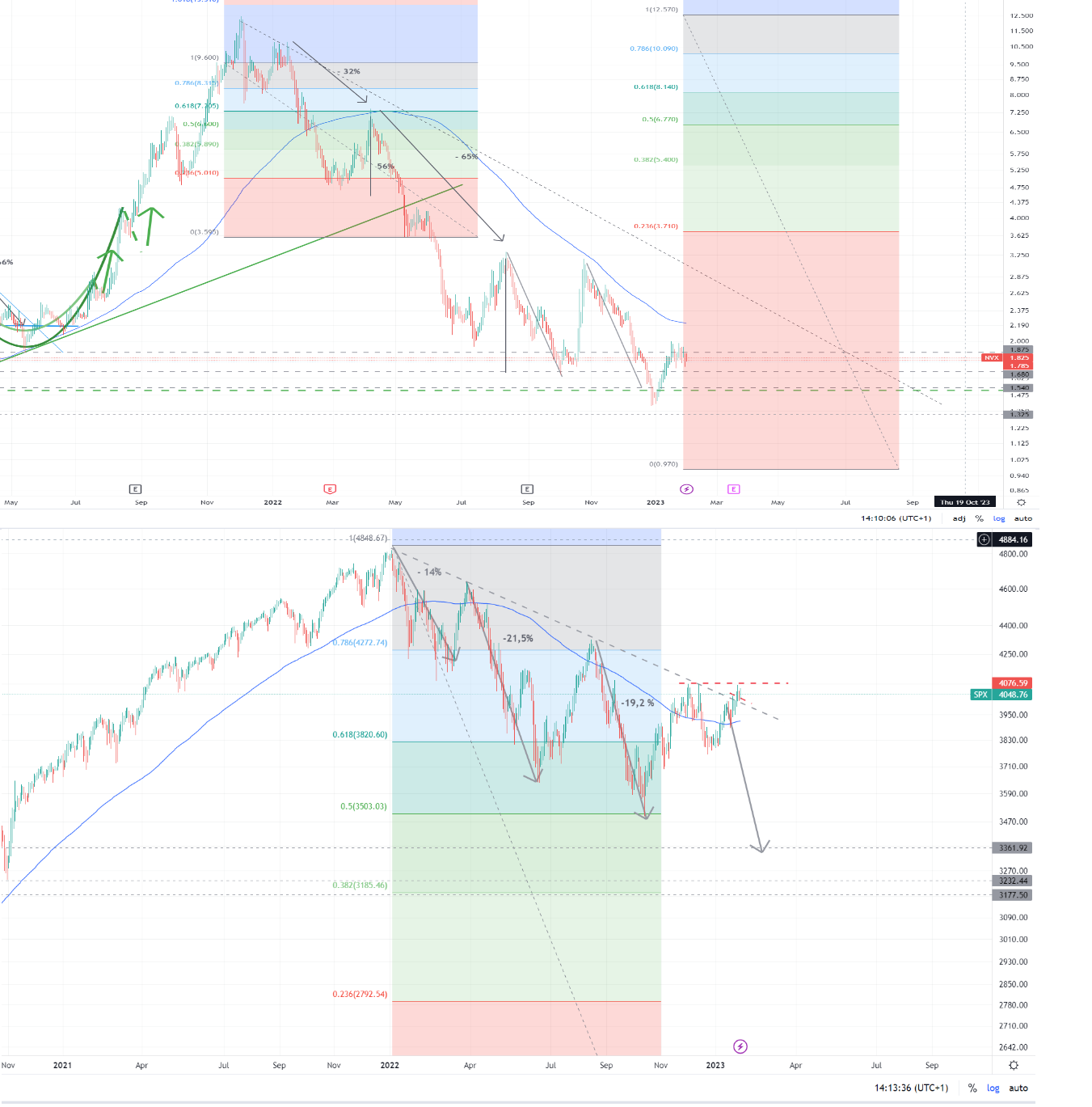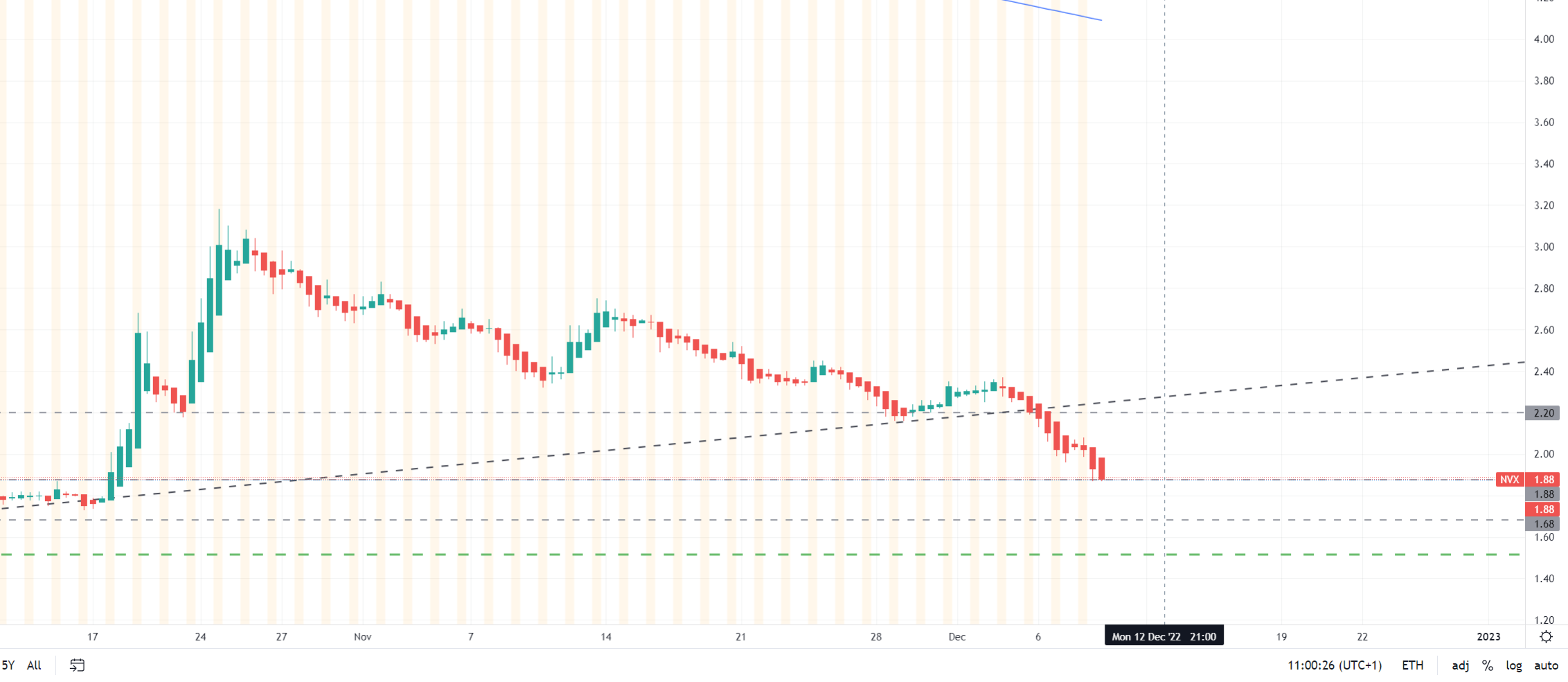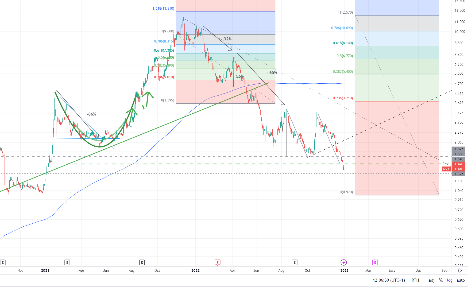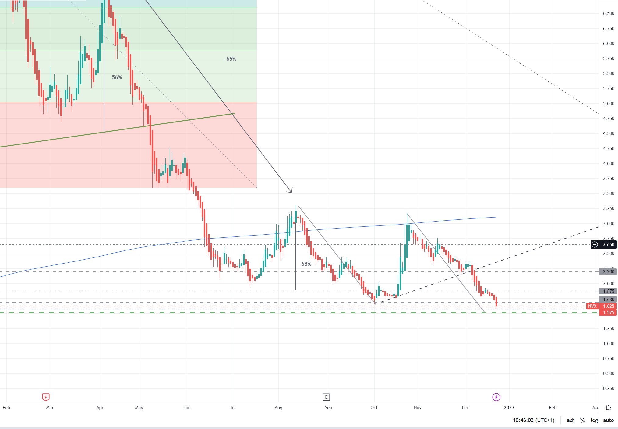 Ich rechne damit, dass wir für NVX vor Weihnachten und dann nochmal bis März zwei Tiefstände sehen. Es ist aber überhaupt nicht ausgemacht, dass wir dann eine Trendaufnahme mit statischen oder dynamischen Aufwärtsbewegungen sehen. Dass kann tatsächlich erstmal eine ziemlich volatile Angelegenheit werden. Insbesondere dürften die Finanzierungsmöglichkeiten für Unternehmen mit gestreckter Bilanz sehr teuer werden.