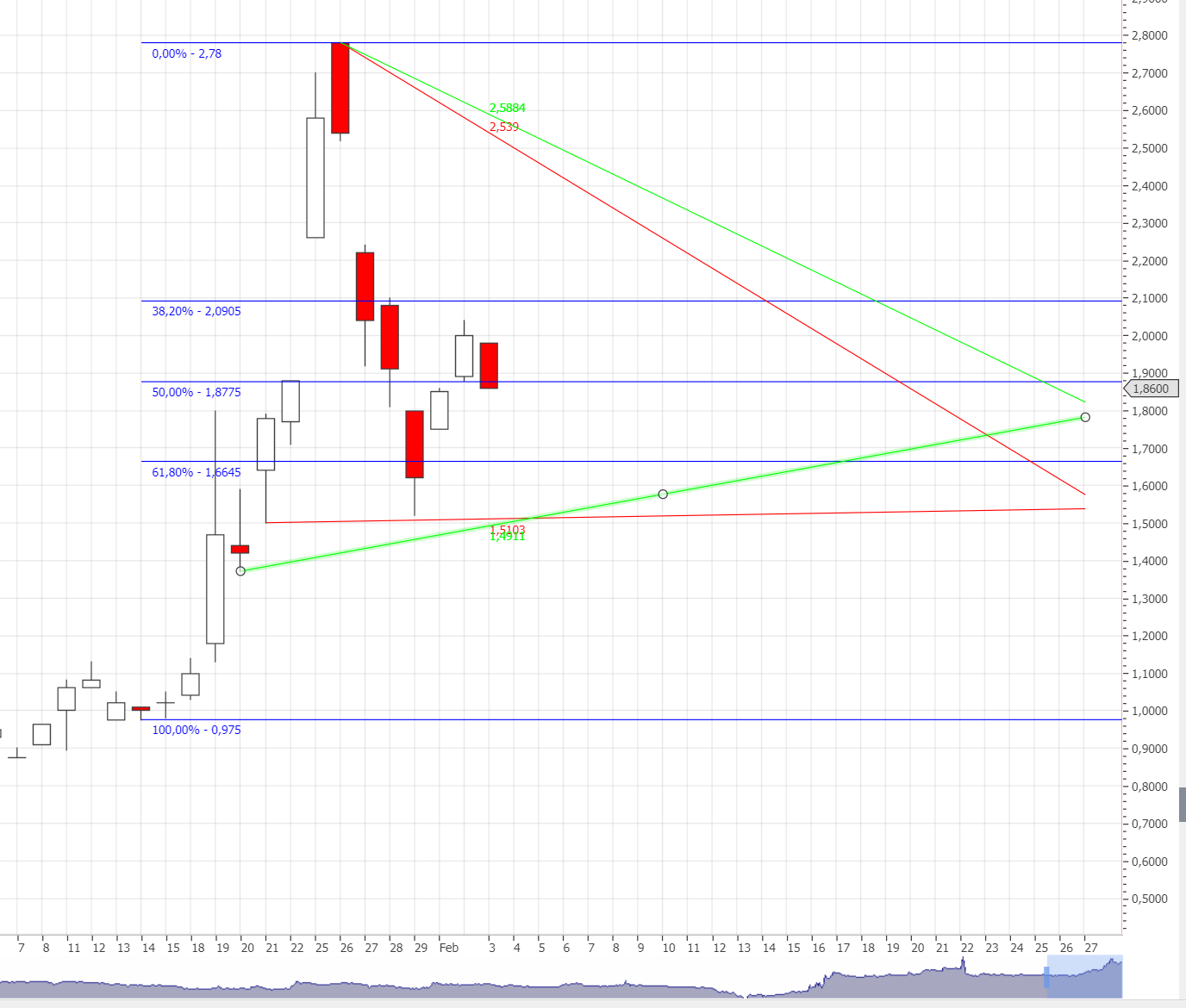 Leider haben wir kein halbwegs homogenes Spannungsfeld zwischen den drei Handelsmärkten. Da hilft es auch nicht, die Charts übereinander zu legen, was die meisten Systeme ohnehin nicht können. Die Australier haben die Vorhersehbarkeit tüchtig kaputt gemacht. Ohne diesen Störfaktor würde sich aus dem Chart ein möglicher Boden auf 1,3702 € empfehlen; das wäre aber auch schon die Marke, bei der die Aktie zur Fortsetzung des Aufwärtstrends starten könnte; sowas ist aber deutlich zu früh. Daher schätze ich (vorsichtig), dass der Wert im 50er Retrace bleibt.