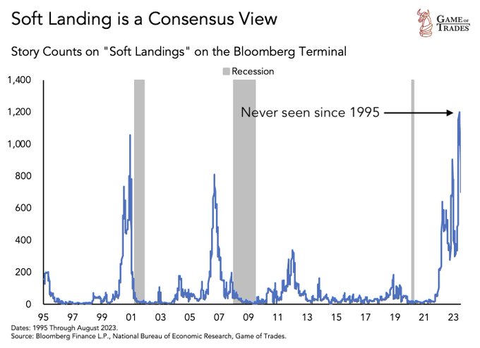 Wir befinden uns immer noch am Anfang der sich entwickelnden Meltup-Phase, aber die Anzahl an Tagen an denen es runtergeht werden weniger und die Turnarounds werden umso Explosiver. Lange Zeit hat die USA hinterhergehinkt, aber mit dem Überschreiten des ATHs Anfang des Jahres haben schon viele Bären das Lager gewechselt. Wenn auch der letzte Bär das Lager gewechselt hat und zum Bullen wurde, dann befinden wir uns nahe am Markttop bzw. kurz vor dem Absturz. Mit dieser Meltup-Phase, die etwa noch 3-4 Monate anhält und mittels FOMO explosiv wird und den breiten Markt erfasst, endet ein jahrzehntelanger Zyklus. Letztendlich wird auch die noch gut laufende Wirtschaft der USA erfasst und zwar von den Folgen der Zinspolitik, in der die Zinsen in noch nie da gewesener Art so schnell so hoch anstiegen. Softlanding? So der allgemeine Tenor, weswegen die Märkte aktuell so stark steigen.