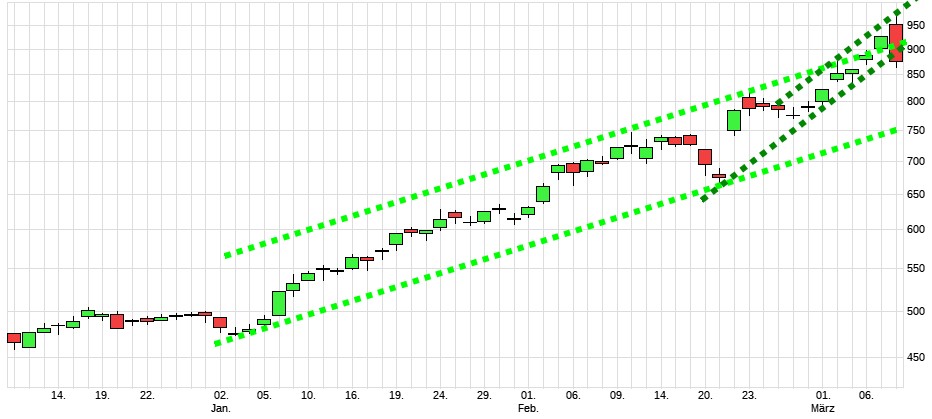 daß wir hier das absolute Top gesehen haben. Jedem dürfte klar sein, daß bei den Aufschlägen in dieser Woche eine Korrektur über kurz oder lang kommen mußte. Ich habe diese Woche mit ungläubigen Blicken auf die Kursaufschläge geschaut, vor allem auch vor- und nachbörslich.