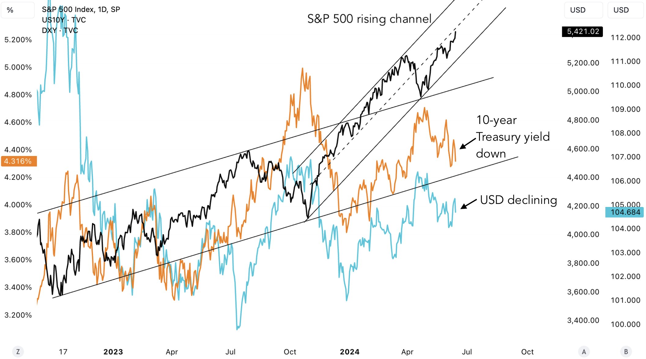 Aber vorher Meltup an den US-Börsen. Sie werden bis ganz zuletzt extrem steigen, weil die Inflation stetig weiter nachlässt und dies für fallende Bonds und in der Folge für Zinssenkungsphantasie sorgt. Die Bonds laufen vor, die FED läuft hinterher.