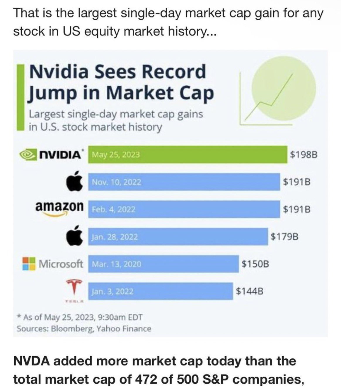 Das würde Apples Rallye vom 10. November 2022 und Amazons Rallye von 4. Februar 2022 übertreffen. An diesen Tagen legte die Marktkapitalisierung der beiden Unternehmen um jeweils rund 191 Milliarden US-Dollar zu. Trotz der Mega-Rallye in diesem Jahr ist Nvidia bisher noch nicht in den eine Billion-Dollar-Club aufgestiegen.