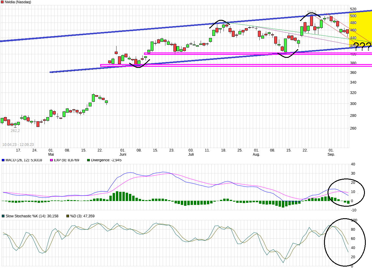 Also für mich sieht es bislang nur nach einer stinknormalen technischen Konso aus, nachdem man kürzlich eben wieder im überkauften Bereich angelangt war. Der MACD und der Stochi im Daily Chart sind aktuell noch fallend, d.h. es gibt noch intakte Verkaufssignale. Man bewegt sich seit Ende Mai in einem leicht ansteigenden blauen Trendkanal und könnte jetzt im Zuge der Konso erstmals wieder an dessen Unterseite pendeln. Wäre so um den Bereich 420$. Sollte man dort wieder nach oben abprallen und auch der Stochi im überverkauften Bereich wieder nach oben kreuzen, dann könnten die Shorties auch ganz schnell wieder ruhig werden. Zudem ist auch jetzt großer Verfallstag und vielleicht auch ein Grund sein warum gewisse größere Hände zu dem Termin tiefere Kurse präferieren. Sollte man sogar unter diese untere blaue Trendkanallinie fallen, dann konsolidiert man eben in einer reinen Seitwärtsbewegung, wo dann bei ca. 400$ auch schon wieder eine Unterstützung anstünde. Der Gesamtmarkt ist aber doch eher unaufgeregt durch den für gewöhnlich schwachen Sommer bislang gekommen. Macht etwas den Eindruck man macht nur etwas Zwischenstopp Richtung Herbst/Weihnachtsrallye bzw. niemand will wirklich aus dem Aktienmarkt raus. Da sollten auch die großen MegaCap-Lieblinge mit im Boot sitzen, wenn es so käme. Also deswegen erstmal schauen, ob sich um 420$ vielleicht schon eine spekulative Einstiegsmöglichkeit ergeben wird.