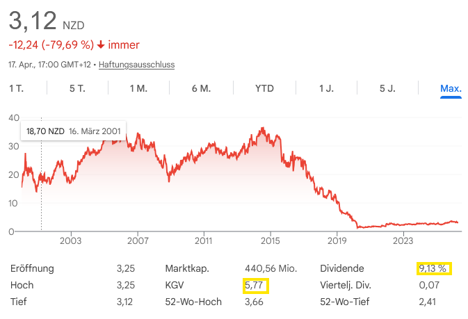 Zur Bewertung: Auf Basis des Schlusskurses von NZ$3,12, rund NZ$100 Mio. Kasse und etwa NZ$69 Mio. Leasingverbindlichkeiten liegt der Unternehmenswert grob bei NZ$399 Mio. Gegenüber der FY26-EBITDA-Guidance von NZ$145–160 Mio. entspricht das nur etwa dem 2,5- bis 2,8-Fachen EBITDA. Das ist auf den ersten Blick sehr günstig. Der Abschlag ist aber nicht irrational, sondern spiegelt reale Risiken wider: lineares Fernsehen schrumpft, Inhalte werden teurer, internationale Studios gehen direkt an den Kunden, und der neuseeländische Markt ist klein. Trotzdem ist die Aktie auf diesem Niveau für mich nicht teuer, sondern eher eine ordentlich gepufferte Ertragsaktie mit Turnaround-Charakter. Die FY26-Guidance lautet für den kombinierten Konzern NZ$820–835 Mio. Umsatz, NZ$145–160 Mio. EBITDA, NZ$62–68 Mio. Capex und mindestens 30 Cent Dividende je Aktie. Allein diese Mindestdividende entspräche auf Basis von NZ$3,12 einer Rendite von rund 9,6 %.