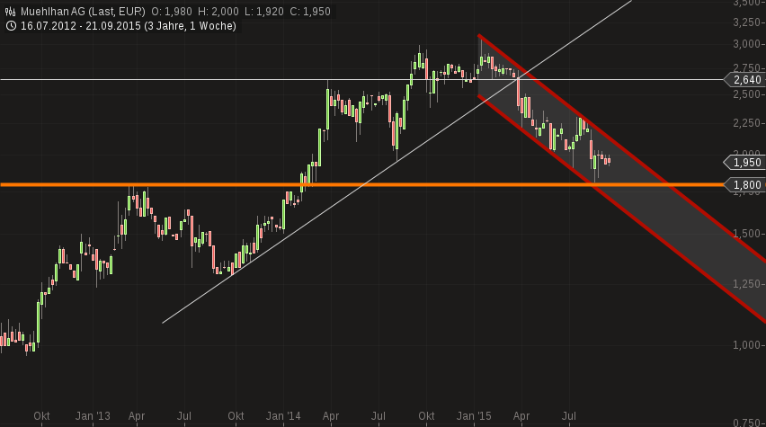 Die Charttechnik verheißt nichts gutes und daher ist die Aktie für mich momentan kein Kauf. Wichtig sind meiner Meinung nach die Marke 1,80€, wo das Augusttief sowie die Hochs aus dem Jahr 2013 liegen und der Abwärtstrendkanal, dessen obere Begrenzung aktuell bei etwa 2,10-2,12 liegt. Man könnte also darüber nachdenken knapp über 1,80€ zu kaufen, da sich dort eine starke Unterstützung befindet. Um sicher zu gehen, kann man aber auch einen Bruch des Trends abwarten. Der schwache Gesamtmarkt könnte nämlich dazu führen, dass sich der Trend bei Muehlhan trotz geringer Substanzkennzahlen weiter fortsetzt.