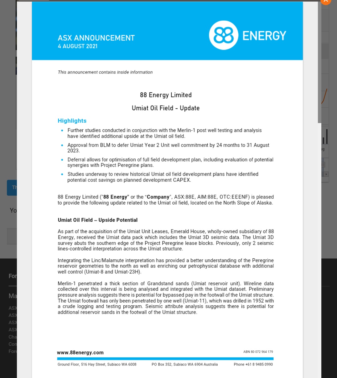 Das Unternehmen hat sich eine 100%ige Beteiligung an dem zugehörigen Projekt gesichert, Rohöl ist auf 70 $/Barrel gestiegen, die Biden-Administration hat die Realisierbarkeit der NPRA-Pachtverträge bestätigt/unterstützt, 88E hat seine Bilanz von allen Schulden befreit, 3,0 Mio. $ an Barmitteln hinzugefügt und in mehreren Proben von Merlin-1 definitiv leichtes Rohöl bestätigt.