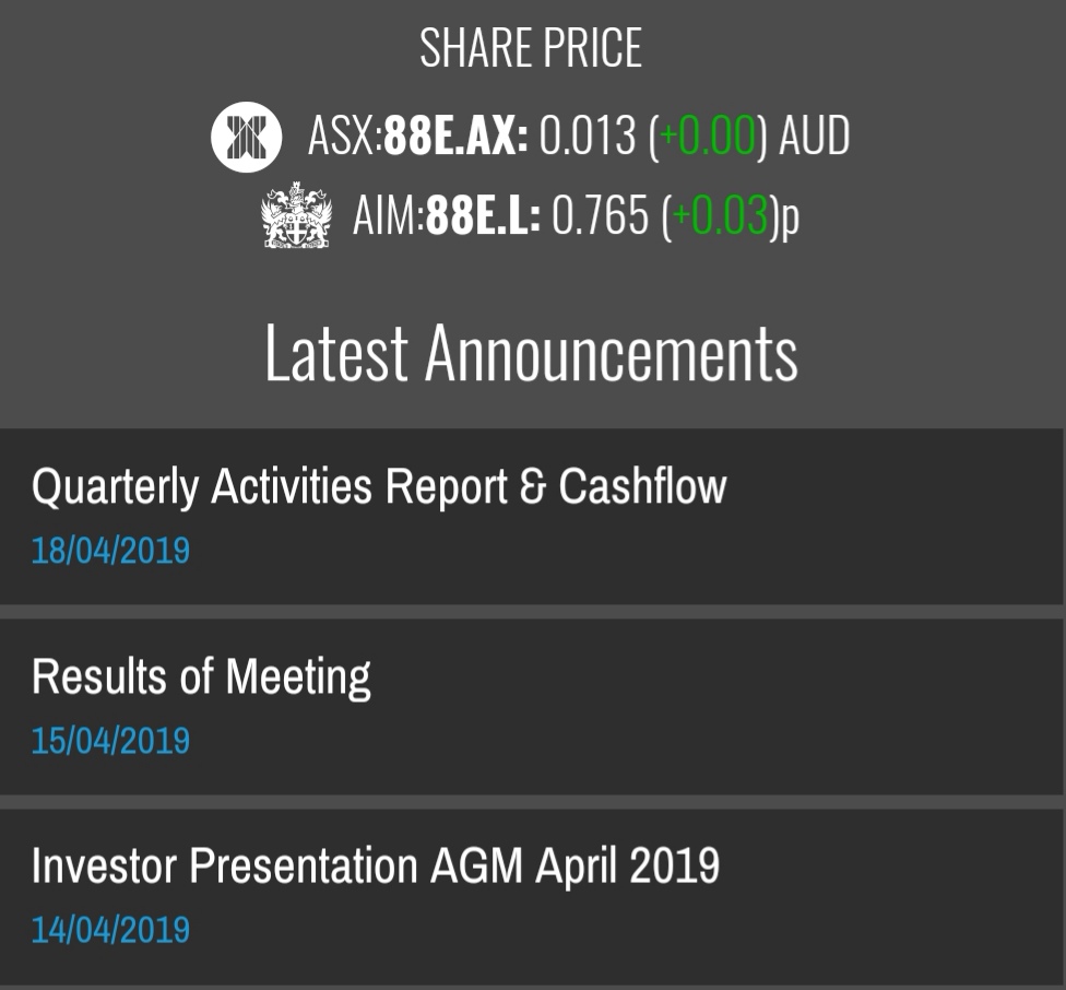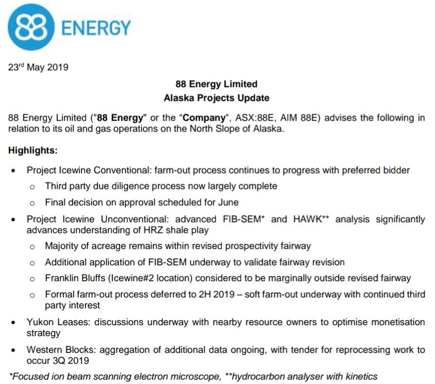 Die Direktoren von 88 Energy Limited ("88 Energy" oder "Company", ASX & AIM: 88E) geben den folgenden Bericht für das Quartal ab, das am 31. März 2019 endete.