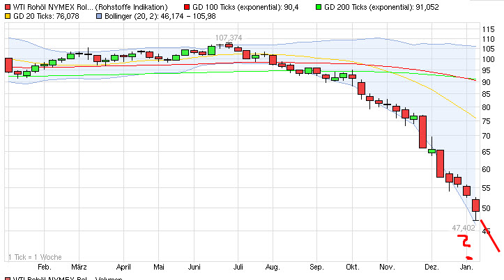 ich möchte in der nächsten Zeit in Öl Long gehen. Ich bin mir allerdings noch ein bisschen unsicher, wie tief Öl noch sinken kann. Soweit nach unten, denke knapp über 40$, wird es nicht mehr gehen.