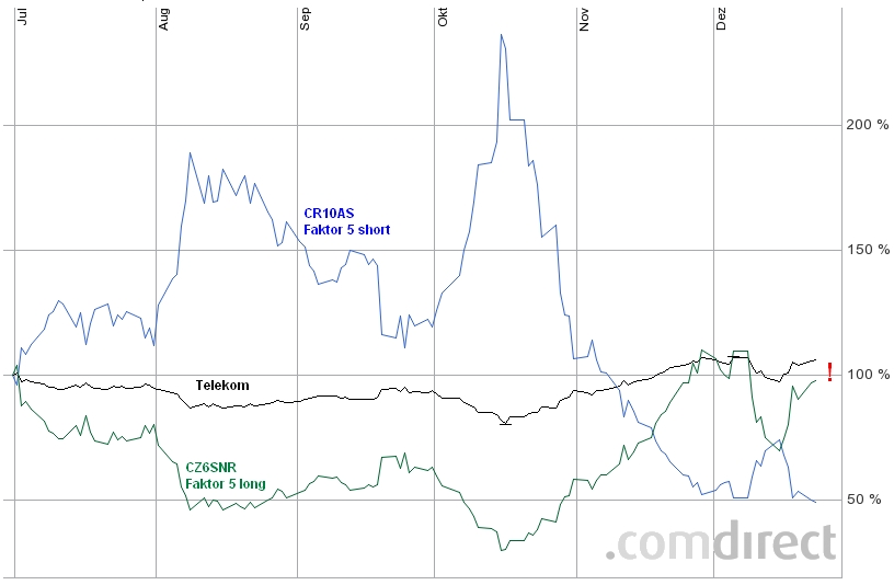 Man kann sich von der Wirkung dieser Derivate ein Bild machen, wenn man die Entwicklung eines Long- und ein Shortzertifikats mit gleichem Faktor mit der Entwicklung des Basiswerts in einem bestimmten Zeitraum in der Vergangenheit vergleicht. Für das folgende Beispiel haben ich den ersten besten Basiswert genommen. Das Bild zeigt einerseits das die Zertis in "richtiger" Richtung gehandelt gut funktionieren, andererseits das Basiswertbewegungen in "falscher" Richtung sich überproportional auswirken. Letzteres gut erkennbar an der Long-Version welches am Ende des Vergleichszeitraums weniger gestiegen ist als der Basiswert.