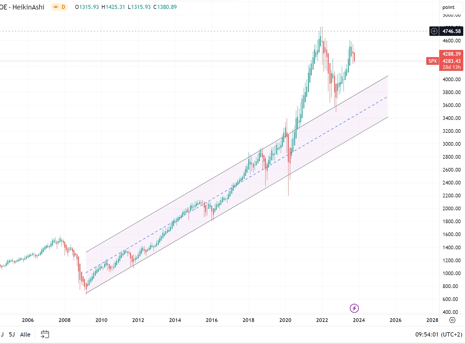 2020-2022 war ein Geldpolitik induziertes beschleunigtes Wachstum, was eben mit in Inflation mündete (sie funktioniert dann dich die Leere). Wir haben korrigiert und sind jetzt innerhalb des oberen Kanalteils fast unten, d.h. das übertriebene Wachstum wurde auskorrigiert und wir sind, sogar eher im tieferen Bereich da, wo wir nach dem Zeitstrahl sein sollten. Wie von slim beschrieben und klar zu sehen, es funktioniert halt nicht "linear", Raten ändern sich, aber es gibt erst einmal eine Breite "Straße", in der sich alles abspielt. Dann gibt es eben die untere "Nebenstraße", auf die es in der Krise mal ausweicht, meist ein kurzer Schlenker und in Krisenzeiten dann mal stärker. Solche Straßen können abknicken, nimmt man einen sehr langen Chart, sieht man das. Das hat aber auch viel mit Regimen zu tun, jetzt wird es tranzendend und sehr wirtschaftstheoretisch oder psychologisch. Wann und ob so ein Knick kommen kann und ob er nach unten oder oben geht, dass weiß man erst nachher. Man darf auch nie vergessen, dass diese Indizes, selbst der S&P 500, nur eine Positivauswahl, per Definitionem, der Wirtschaft sind. Sie werden nie in der Breite die Volkswirtschaft exakt repräsentieren.