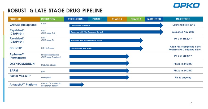 - RAYALDEE-Linienerweiterung bei Dialysepatienten mit SHPT: OPKO entwickelt RAYALDEE für Stage 5 CKD-Patienten mit SHPT, die sich mit dem Partner Vifor Fresenius dialysiert. Das Unternehmen rechnet mit der Einleitung einer klinischen Phase-2-Studie im zweiten Halbjahr 2017.