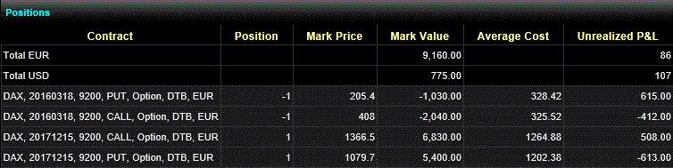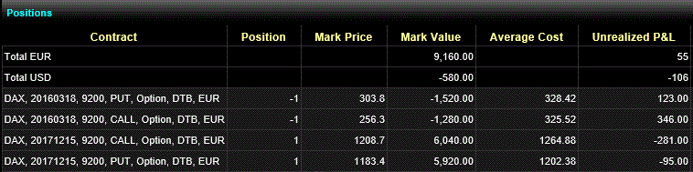 Durch den Handel hat sich die Marginforderung hat sich von ca. 900€ auf -700€ reduziert. Man sieht, das das Rollen einer Position weiter im Geld auch richtig Geld kostet. Für die Erhöhung des Strikes bei CBK um 0,80€ mussten 0,62€ bezahlt werden. Für das Erhöhen des Strikes bei EOA um 0,50€ mussten dagegen nur 0,02€ bezahlt werden.