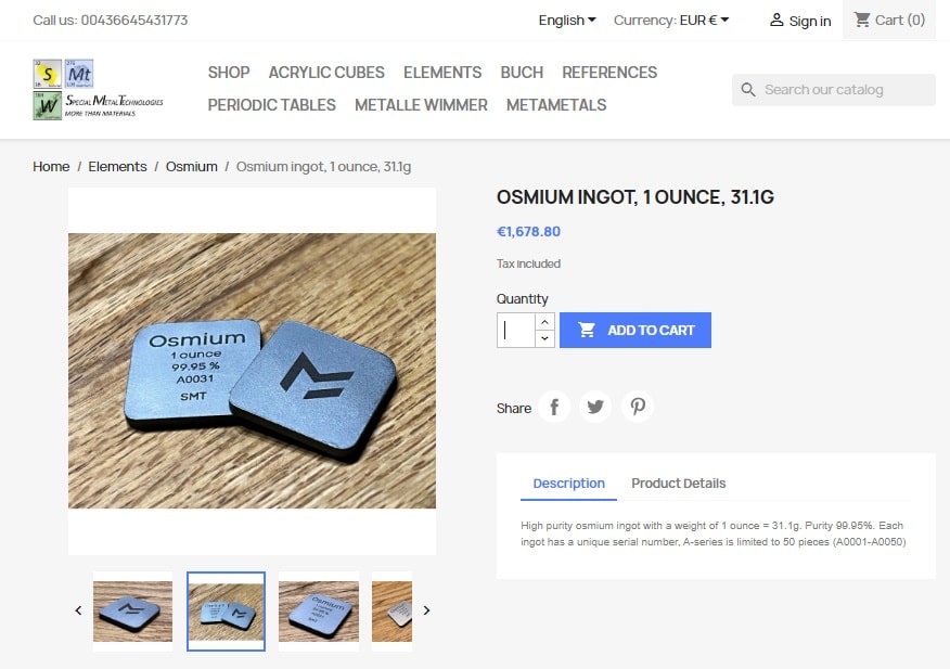 Es ist das einzige Metall mit einer einzigartigen Blaufärbung und das dichteste Element, was es extrem fälschungssicher macht. Im Verhältnis zu seiner Seltenheit ist es das bei weitem billigste Edelmetall! Es wird tausendmal weniger pro Jahr gefördert als Gold und kostet dennoch weniger.