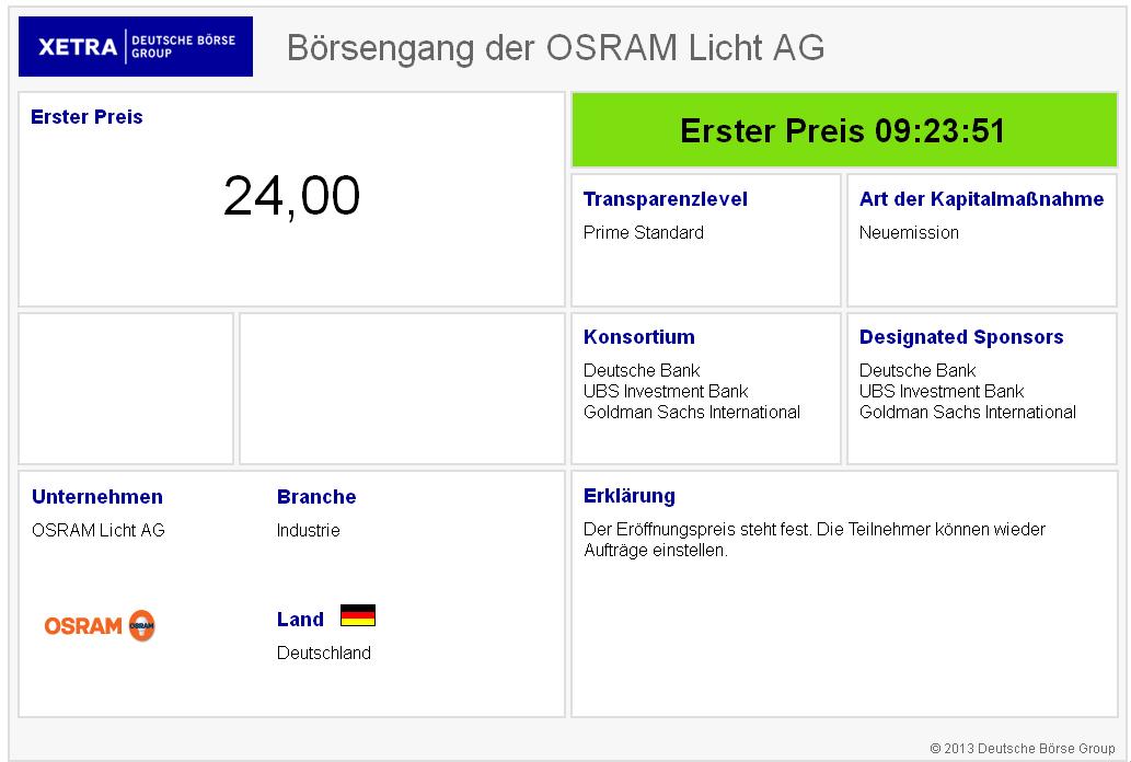 Die OSRAM Licht AG startet heute unter dem Börsenkürzel "OSR" an der Frankfurter Wertpapierbörse und an der Börse München in den Handel. "Das heutige Listing schlägt ein neues Kapitel in der über 100-jährigen Unternehmensgeschichte auf und eröffnet große Chancen für die künftige Entwicklung des Unternehmens", so der Osram-Vorstandsvorsitzende Wolfgang Dehen. Das Management war zuletzt auf Roadshow an wichtigen internationalen Kapitalmärkten und hatte bei rund 400 Fonds und Banken für Osram geworben.