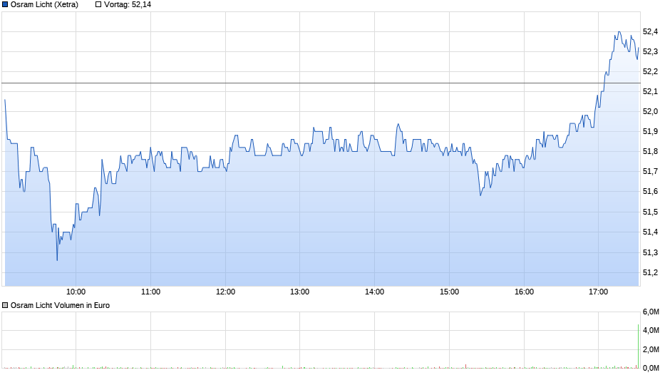 Was das momentan für Osram heißt? Der Kurs ist in den letzten Tagen oft nach einer guten Eröffnung runter gegangen und zum Nachmittag wurde dann wieder gekauft. So gesehen steigen momentan in der Tat die Großanleger wieder ein. Weil die eben vor allem nachmittags aktiv sind. Auch das scheint eher für ein positives Sentiment in der Aktie zu sprechen.
