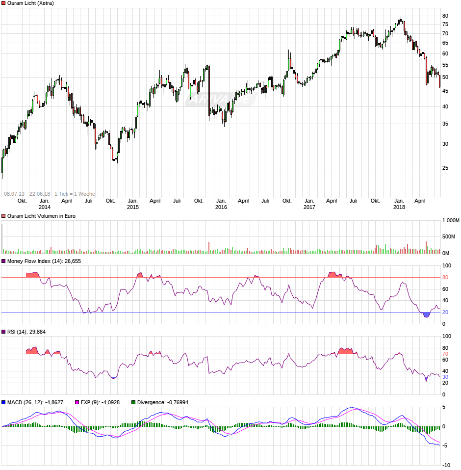 Der Trend in Osram ist leider weiterhin abwärts gerichtet und mit dem Rückfall unter 50 EUR drohen kurzfristig neue Tiefs. Die ersten Ziele liegen jedoch schon im Bereich von ca. 46,50 EUR. Dort wäre eine zumindest kleine Stabilisierung möglich. Sollte es den Käufern nicht gelingen, einen Boden auszubilden, könnte es in den nächsten Wochen aber weiter abwärts auf 44-43 EUR gehen.