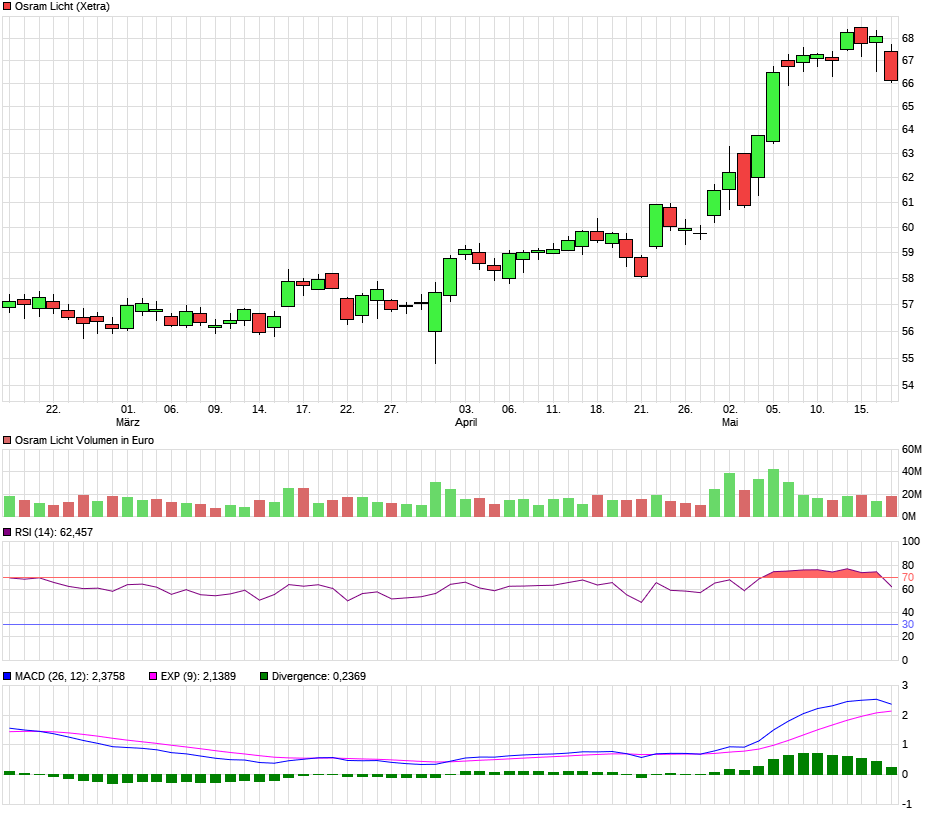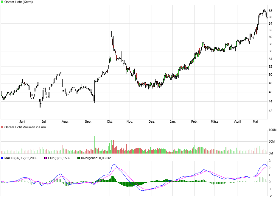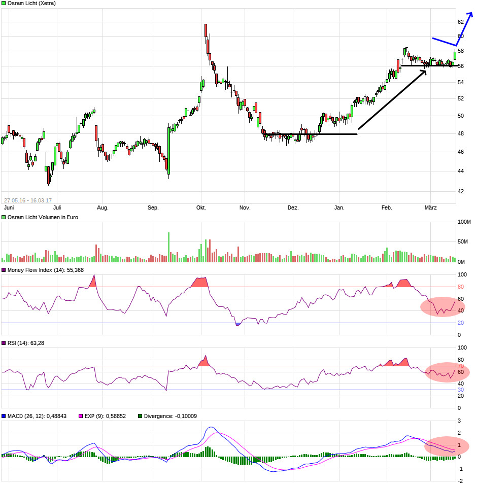 Osram hat auf dem jetzigen Stand ein extrem schlechtes Chance-Risiko-Verhältnis. Die Aktie ist massiv überbewertet, und es fehlt jegliche Aufwärtsdynamik nach dem eigentlichen Ausbruch aus der Aufwärtsflagge.